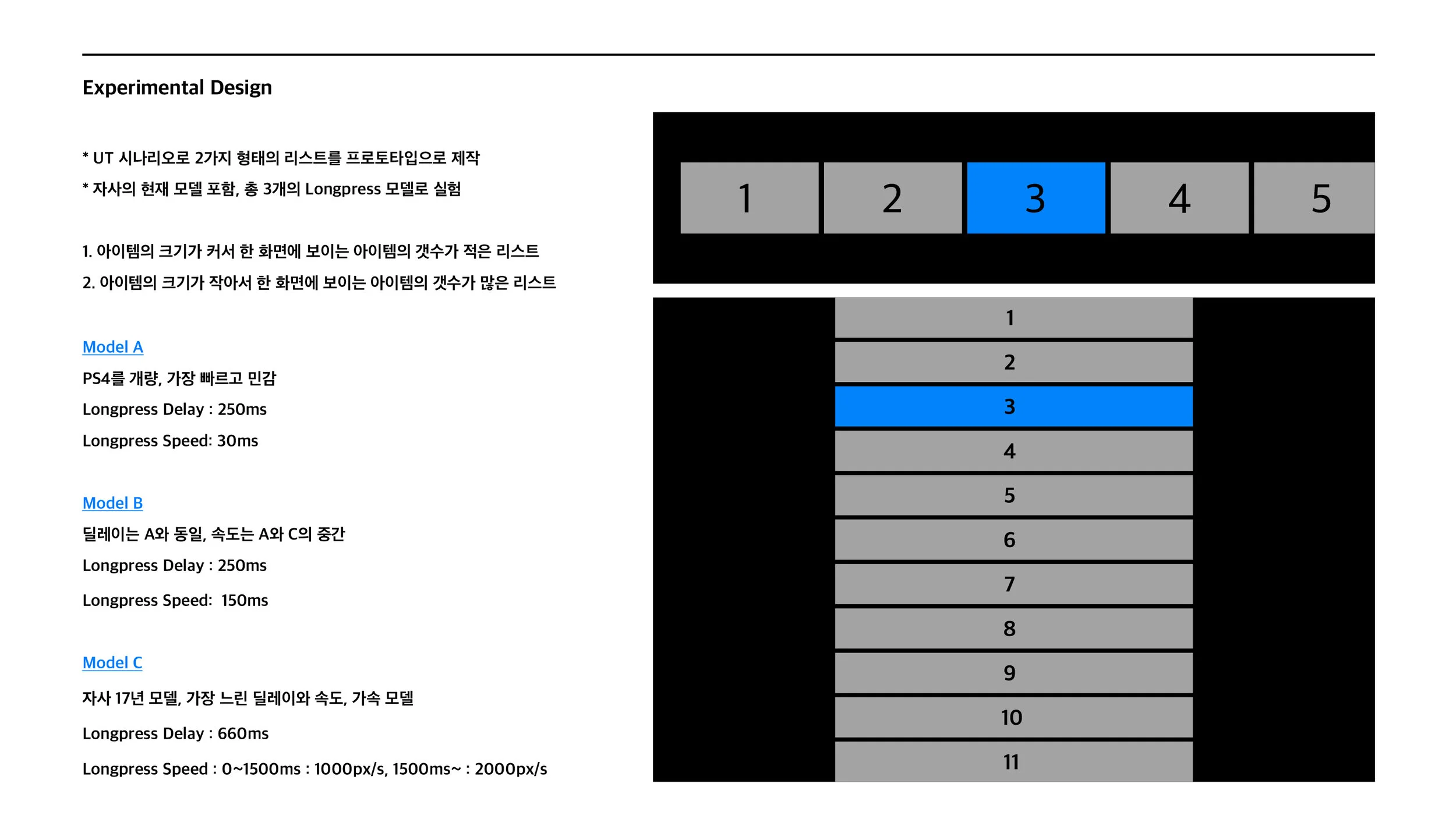 2017년까지 유지하고 있던 삼성 TV의 리모컨 4방향키에 대한 문제를 발견하고 해결한 과정과 결과입니다. 사업부 내에서 공감대가 이뤄지지 않고 있던 문제의 발견 및 정의, 리서치, 실험 설계, 실험, 스펙 도출의 과정을 통한 실험 결과로 2018년부터 전 양산 라인업에 적용되었습니다.